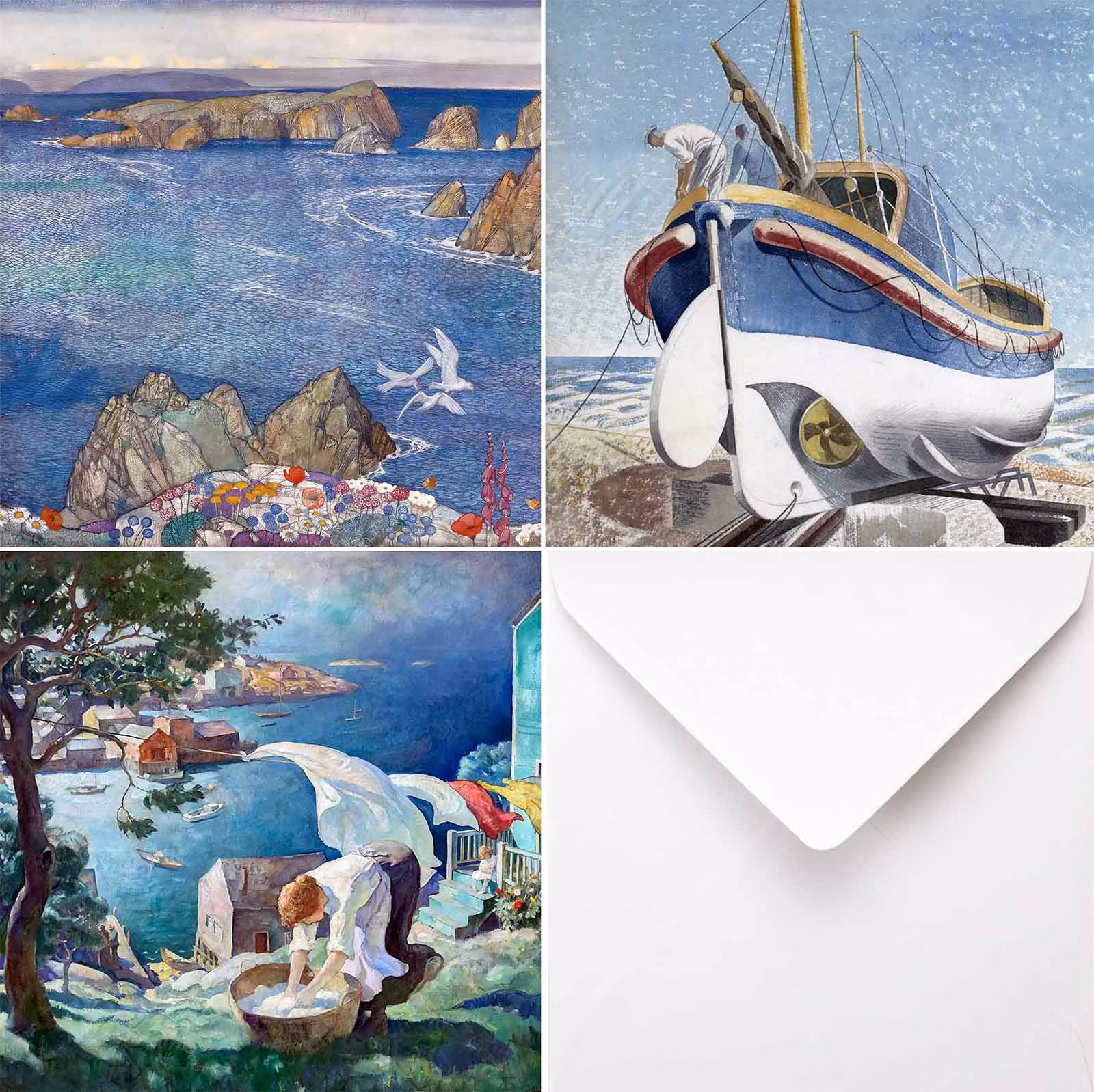 Introducing the Coastal Collection – three beautiful greetings cards depicting life beside the sea. Featuring ‘Sark’, by Reginald Frampton, ‘The Lifeboat’ by Eric Ravilious, and ‘Washing Day, Maine’, by Newell Wyeth.